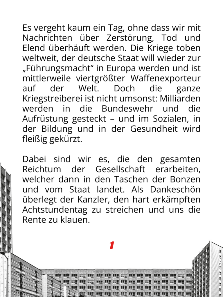 Es vergeht kaum ein Tag, ohne dass wir mit Nachrichten über Zerstörung, Tod und Elend überhäuft werden. Die Kriege toben weltweit, der deutsche Staat will wieder zur „Führungsmacht“ in Europa werden und ist mittlerweile viertgrößter Waffenexporteur auf der Welt. Doch die ganze Kriegstreiberei ist nicht umsonst: Milliarden werden in die Bundeswehr und die Aufrüstung gesteckt – und im Sozialen, in der Bildung und in der Gesundheit wird fleißig gekürzt.