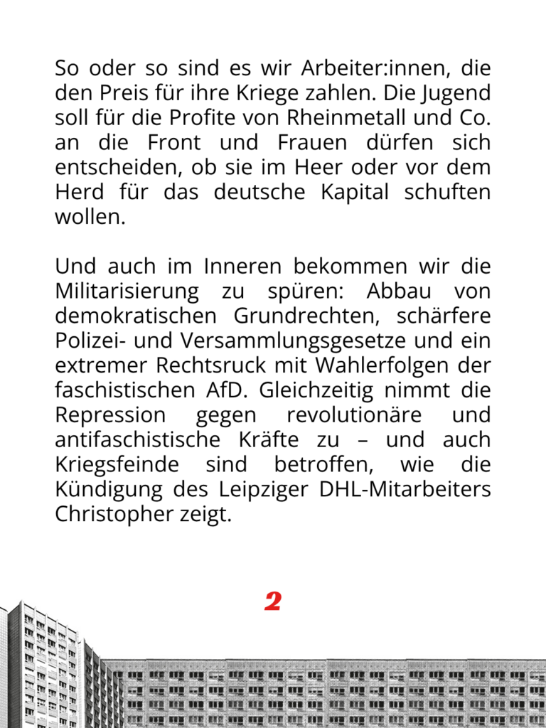 Und auch im Inneren bekommen wir die Militarisierung zu spüren: Abbau von demokratischen Grundrechten, schärfere Polizei- und Versammlungsgesetze und ein extremer Rechtsruck mit Wahlerfolgen der faschistischen AfD. Gleichzeitig nimmt die Repression gegen revolutionäre und antifaschistische Kräfte zu – und auch Kriegsfeinde sind betroffen, wie die Kündigung des Leipziger DHL-Mitarbeiters Christopher zeigt.