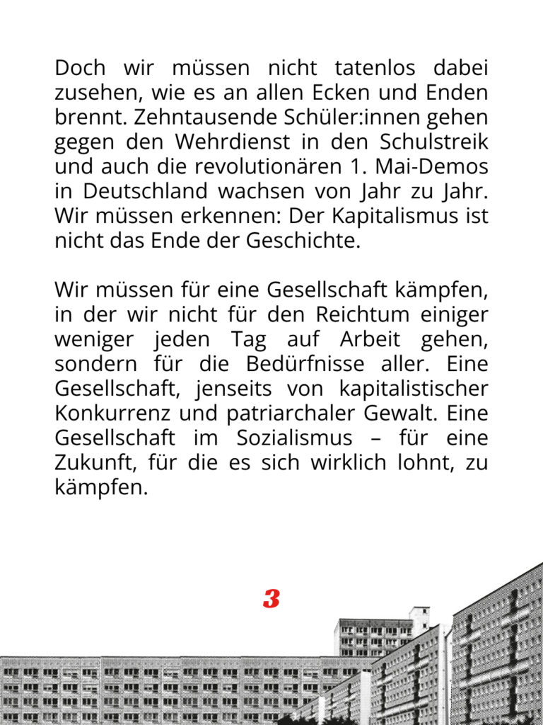 Doch wir müssen nicht tatenlos dabei zusehen, wie es an allen Ecken und Enden brennt. Zehntausende Schüler:innen gehen gegen den Wehrdienst in den Schulstreik und auch die revolutionären 1. Mai-Demos in Deutschland wachsen von Jahr zu Jahr. Wir müssen erkennen: Der Kapitalismus ist nicht das Ende der Geschichte.