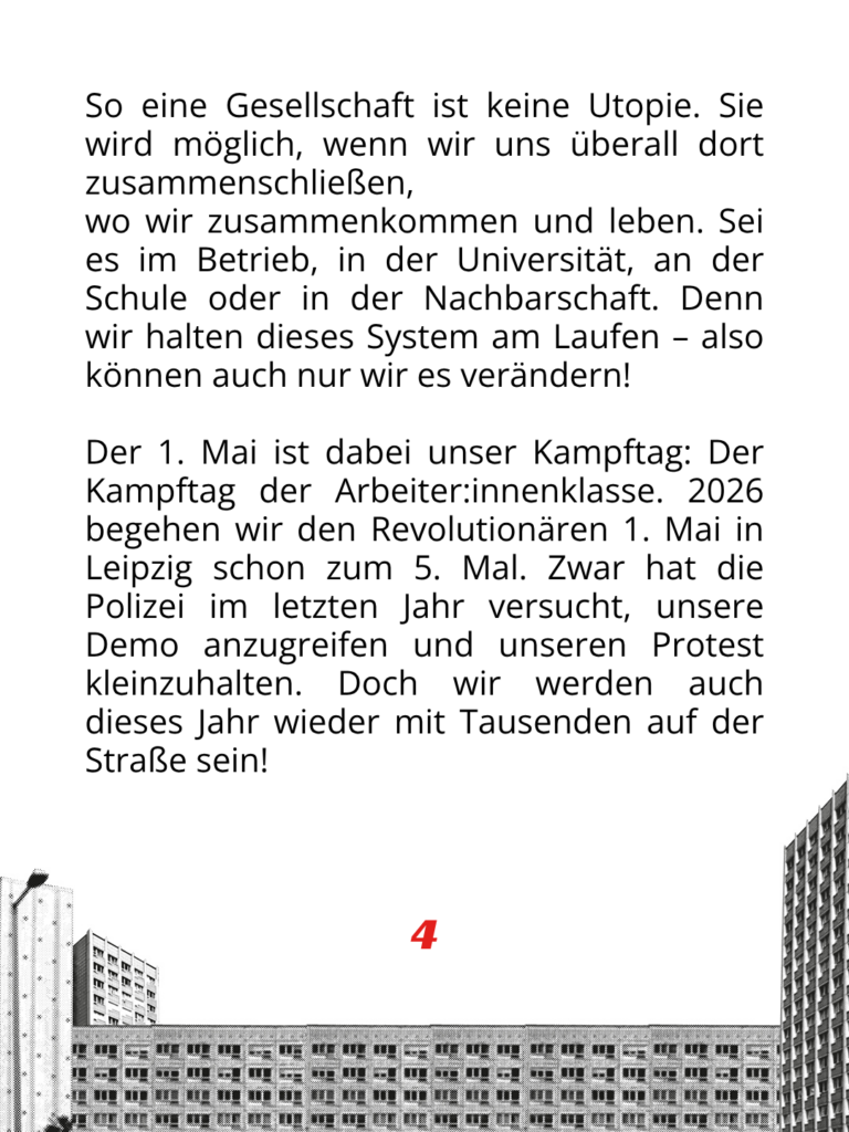 Der 1. Mai ist dabei unser Kampftag: Der Kampftag der Arbeiter:innenklasse. 2026 begehen wir den Revolutionären 1. Mai in Leipzig schon zum 5. Mal. Zwar hat die Polizei im letzten Jahr versucht, unsere Demo anzugreifen und unseren Protest kleinzuhalten. Doch wir werden auch dieses Jahr wieder mit Tausenden auf der Straße sein!