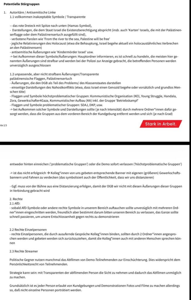 In einem internen Schriftstück will der DGB revolutionäre und palästinasolidarische Gruppen von seiner Demonstration ausschließen. Mehr noch: sie unterteilen Gruppen und Organisationen in „höchstproblematisch“ und „problematisch“, welche aktiv an der revolutionären 1. Mai Demonstration mitwirken. Außerdem wird internationalistischen, also palästinasolidarischen, Positionen und Kritik am DGB mit dem Ausschluss gedroht. Das ist Staatsräson und Klassenpolitik von oben – schwarz auf weiß.